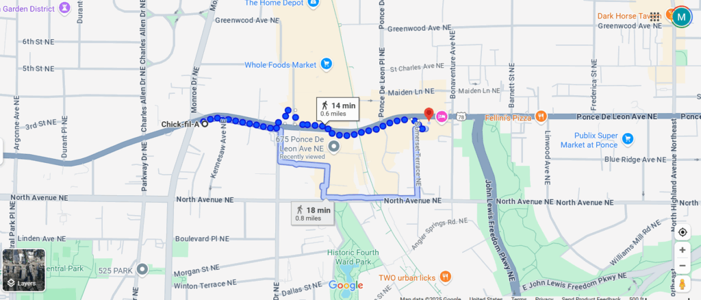 Atlanta, Georgia – Atlanta, the city that brought the world Coca-Cola, lemon pepper wings, and an astonishing number of streets named “Peachtree,” has done it again. This time with a poultry-powered punchline: two Chick-fil-As, standing just three blocks apart, clucking proudly at 689 Boulevard NE and 777 Ponce de Leon Ave NE; only a short 14 minute walk away from each other.