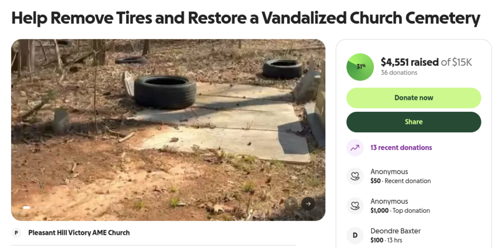 The church has launched an official GoFundMe campaign titled “Help Remove Tires and Restore a Vandalized Church Cemetery” to raise the $15,000 needed to remove the tires, repair damaged headstones, and install a security system to prevent future vandalism. Under Georgia law, “egregious littering” of this magnitude can be upgraded from a misdemeanor to a felony, potentially leading to prison time and fines of up to $25,000.